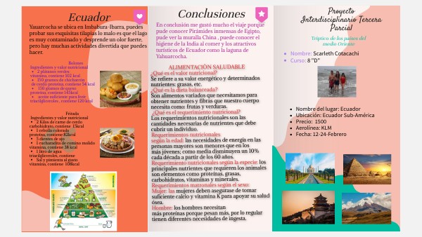 En conclusión me gustó mucho el viaje porque pude conocer Pirámides inmensas de Egipto, pude ver la muralla China , puede conocer el higiene de la India al comer y los atractivos turísticos de Ecuador como la laguna de Yahuarcocha.