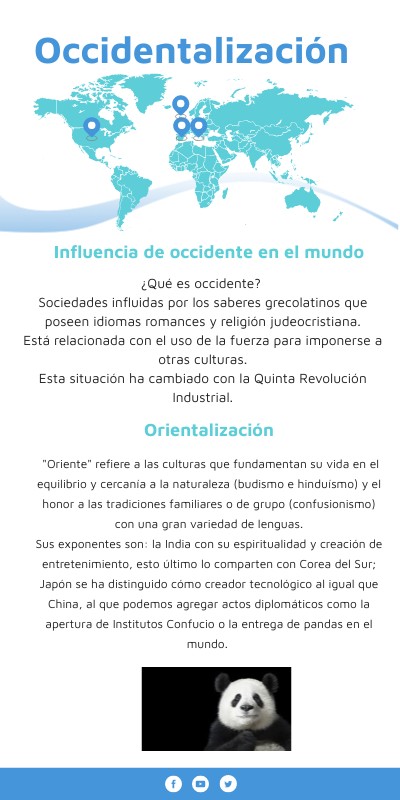 ¿Qué es occidente? Sociedades influidas por los saberes grecolatinos que poseen idiomas romances y religión judeocristiana. Está relacionada con el uso de la fuerza para imponerse a otras culturas. Esta situación ha cambiado con la Quinta Revolución Industrial.