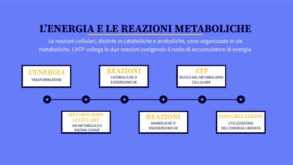 Le reazioni cellulari, distinte in cataboliche e anaboliche, sono organizzate in vie metaboliche. L'ATP collega le due reazioni svolgendo il ruolo di accumulatore di energia.