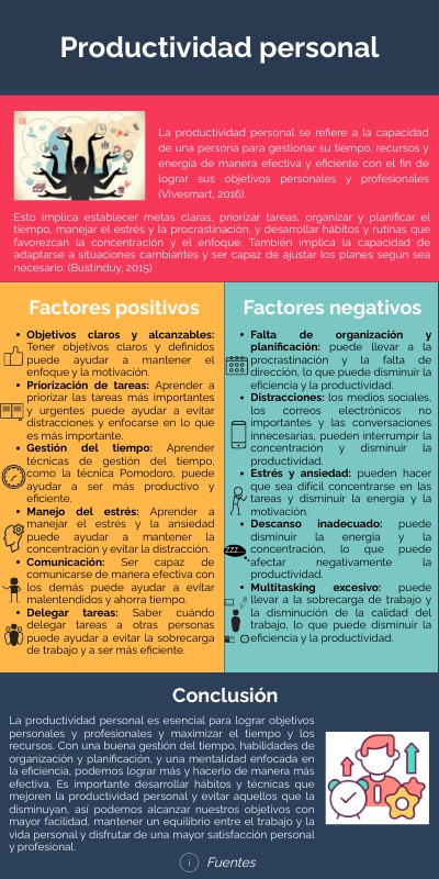 La productividad personal se refiere a la capacidad de una persona para gestionar su tiempo, recursos y energía de manera efectiva y eficiente con el fin de lograr sus objetivos personales y profesionales (Vivesmart, 2016).
