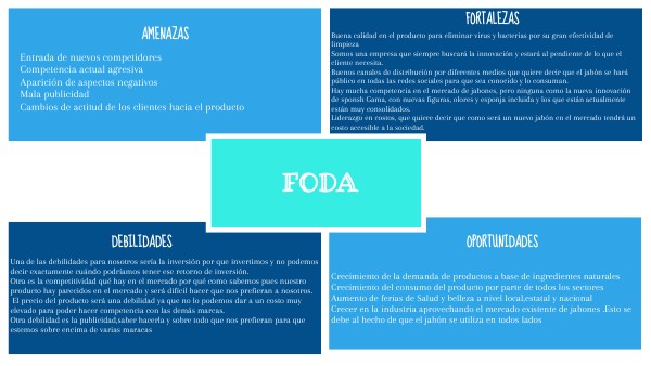 Buena calidad en el producto para eliminar virus y bacterias por su gran efectividad de limpieza Somos una empresa que siempre buscará la innovación y estará al pendiente de lo que el cliente necesita. Buenos canales de distribución por diferentes medios que quiere decir que el jabón se hará público en todas las redes sociales para que sea conocido y lo consuman. Hay mucha competencia en el mercado de jabones, pero ninguna como la nueva innovación de sponsh Gama, con nuevas figuras, olores y esponja incluida y los que están actualmente están muy consolidados. Liderazgo en costos, que quiere decir que como será un nuevo jabón en el mercado tendrá un costo accesible a la sociedad.