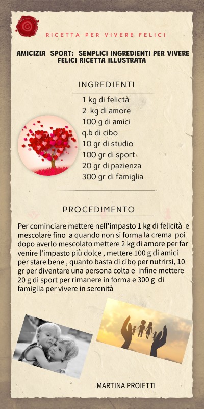 Per cominciare mettere nell'impasto 1 kg di felicità e mescolare fino a quando non si forma la crema poi dopo averlo mescolato mettere 2 kg di amore per far venire l'impasto più dolce , mettere 100 g di amici per stare bene , quanto basta di cibo per nutrirsi, 10 gr per diventare una persona colta e infine mettere 20 g di sport per rimanere in forma e 300 g di famiglia per vivere in serenità