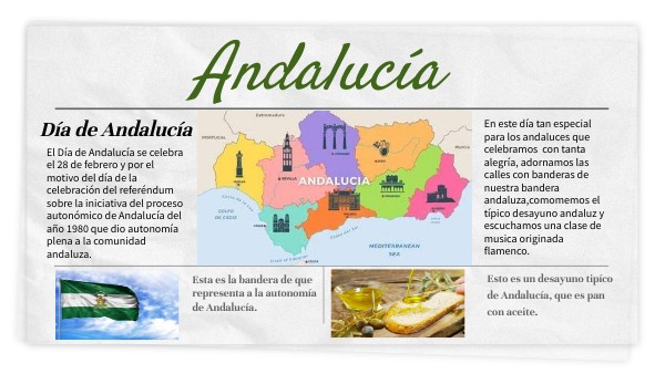 En este día tan especial para los andaluces que celebramos con tanta alegría, adornamos las calles con banderas de nuestra bandera andaluza,comomemos el típico desayuno andaluz y escuchamos una clase de musica originada flamenco.