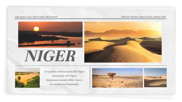 https://www.lenius.it/situazione-in-niger/https://www.treccani.it/enciclopedia/niger https://www.vita.it/it/article/2018/03/28/niger-le-associazioni-di-mamme-che-combattono-per-listruzione-delle-pr/146388/ https://www.goafrique.it/storia-del-niger/ https://www.africa-express.info/2023/02/09/situazione-disastrosa-delle-scuole-in-africa-in-niger-cadono-a-pezzi-e-in-namibia-gli-alberi-diventato-aule/amp/ https://www.atlanteguerre.it/conflict/niger/ https://it.wikipedia.org/wiki/Niger https://www.missioniafricane.it/niger-leducazione-scolastica-e-la-via-per-dare-alla-donna-il-suo-posto-nella-societa/#:~:text=Il%20liceo%20francese%20della%20capitale,frequentare%20questa%20prestigiosa%20istituzione%20scolastica.