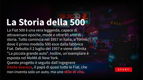 La Fiat 500 è una vera leggenda, capace di attraversare epoche, mode e oltre 60 anni di storia. Tutto comincia nel 1957 in Italia, a Torino; dove il primo modello 500 esce dalla fabbrica Fiat. Debutta il 2 luglio del 1957 e viene definita "La piccola grande auto". Inoltre, un'esemplare è esposta nel MoMA di New York. Questo progetto è seguito dall'ingegnere Dante Giacosa, il papà di quasi tutte le Fiat, che non inventa solo un auto, ma uno stile di vita.