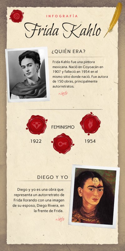 Frida Kahlo fue una pintora mexicana. Nació en Coyoacán en 1907 y falleció en 1954 en el mismo sitio donde nació. Fue autora de 150 obras, principalmente autorretratos.