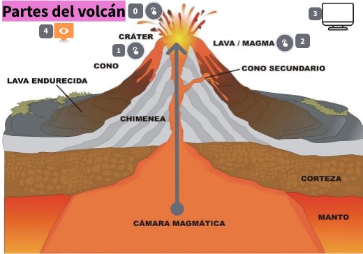 Explicación de las partes de un volcán y los materiales que estos expulsan al erupcionar.