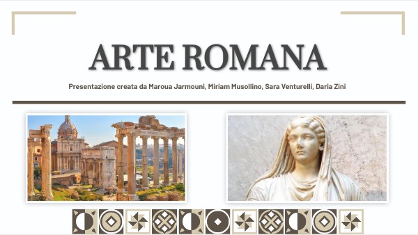 I romani furono un popolo che si stabilì, secondo la tradizione, sul colle Palatino, o più probabilmente sull'isola Tiberina, nel 1753 a.C. L'arte romana attraversò due grandi periodi: Dapprima l'Età repubblicana, caratterizzata dall'arte dell'utile e dal primo incontro con l'arte greca (212 a.C.) ; Successivamente l'Età imperiale, caratterizzata invece da una ripresa del classicismo, riadattato ad esigenze romane di solennità e propaganda.