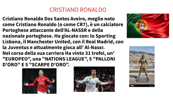 Cristiano Ronaldo Dos Santos Aveiro, meglio noto come Cristiano Ronaldo (o come CR7), è un calciatore Portoghese attaccante dell'AL-NASSR e della nazionale porteghese. Ha giocato con: lo Sporting Lisbona, il Manchester United, con il Real Madrid, con la Juventus e attualmente gioca all' Al-Nassr.Nel corso della sua carriera Ha vinto 31 trofei, un' "EUROPEO", una "NATIONS LEAGUE", 5 "PALLONI D'ORO" E 5 "SCARPE D'ORO".