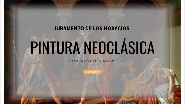 ESTILO ARTÍSTICO Y SUS CARACTERÍSTICAS: Pintura neoclásica: Obra dedicada al combate que predecio al fin del conflicto entre Roma y Alba. El paisaje o fondo no está muy resaltado, mientras que las figuras en primer plano están remarcadas para acentuar su importancia. CARACTERÍSTICAS DEL ESTILO ARTÍSTICO QUE SE DAN EN LA OBRA: Se inspira en los monumentos de la antigüedad grecorromana. Concepto de belleza basado en la pureza de las líneas arquitectónicas, en la simetría y en las proporciones sujetas a las leyes de la medida y las matemáticas.