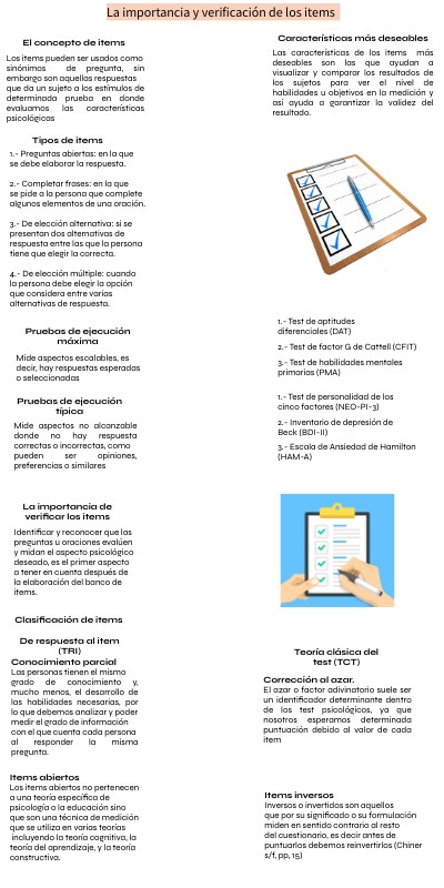 Los items pueden ser usados como sinónimos de pregunta, sin embargo son aquellas respuestas que da un sujeto a los estímulos de determinada prueba en donde evaluamos las características psicológicas