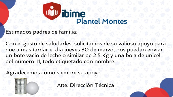 Estimados padres de familia: Con el gusto de saludarles, solicitamos de su valioso apoyo para que a mas tardar el día jueves 30 de marzo, nos puedan enviar un bote vacio de leche o similar de 2.5 Kg y una bola de unicel del número 11, todo etiquetado con nombre.