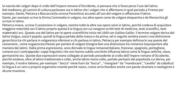 la nascita dei volgari dopo il crollo dell’impero romano d’Occidente, si pensava che si fosse perso l’uso del latino. Nel medioevo, gli uomini di cultura parlavano sia in latino che i volgari che si affermano in quel periodo.a Firenze per esempio, Dante, Petrarca e Boccaccio(la corona Fiorentina) accanto all’uso del volgare si affiancava il latino. Dante, per esempio scrive la Divina Commedia in volgare, ma altre opere come de volgare eloquentia e de Monarchia gli scrisse in latino. Petrarca invece, scrisse il canzoniere in volgare, mentre tutte le altre sue opere sono in latino, perché credeva di acquistare maggiore notorietà con il latino proprio questa è la lingua con cui vengono scritti testi di medicina, testi scientifici, testi matematici ecc. Questo uso del latino per le opere scientifiche inizio nel 1600 con Galileo Galilei. il termine volgare deriva dal latino Vulgus, ossia il popolo, quindi la lingua parlata dalla massa e da prima, ed in seguito sembra esserci una distinzione gerarchica tra chi parlava in volgare(era inferiore) e chi parlava in latino, Petracca per esempio definiva le sue poesie del cansoniere , come nugae(sciocchezze) per parlare di volgare bisogna fare una distinzione tra romanice loqui(parlare alla maniera dei latini). Dalla prima espressione, sono derivate le lingue romanze(italiano, francese, spagnolo, portoghese, rumeno ecc) contrapposte i ceppi linguistici che non hanno subito una forte influenza latina come le lingue celtiche, slave, germaniche ecc. Queste due espressioni erano collegate al periodo precedente al crollo dell’impero romano d’Occidente, perché esisteva, oltre al latino tradizionale e colto, anche latino meno colto, parlato perlopiù dal popolo(da cui deriva, per esempio, il nostro italiano; per esempio “ bocca“ viene fuori da “bucca” , “mangiare” da “manducare”, “cavallo” da cabollus) la lingua è un vero e proprio organismo vivente poiché nasce, cresce arricchendosi anche con parole straniere e neologismi e alcune muoiono.