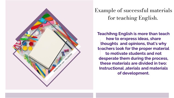 Teachihng English is more than teach how to erxpress ideas, share thoughts and opinions, that's why teachers look for the proper material to motivate students and not desperate them during the process, these materials are divided in two: Instructional ,aterials and materials of development.