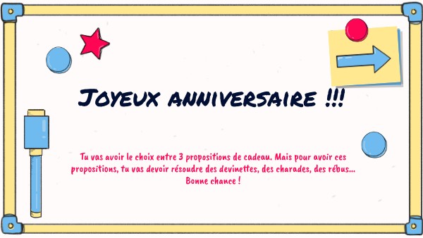 Tu vas avoir le choix entre 3 propositions de cadeau. Mais pour avoir ces propositions, tu vas devoir résoudre des devinettes, des charades, des rébus...Bonne chance !