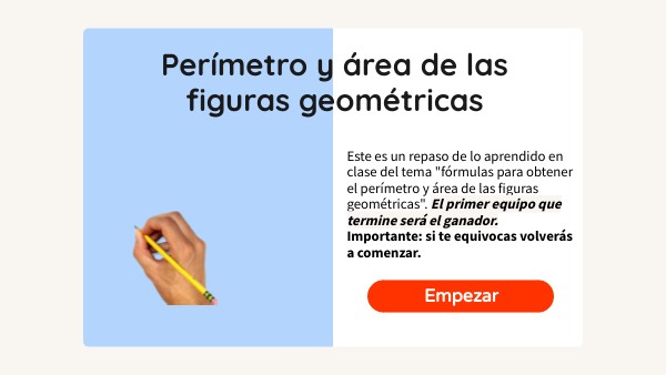 Este es un repaso de lo aprendido en clase del tema "fórmulas para obtener el perímetro y área de las figuras geométricas". El primer equipo que termine será el ganador. Importante: si te equivocas volverás a comenzar.