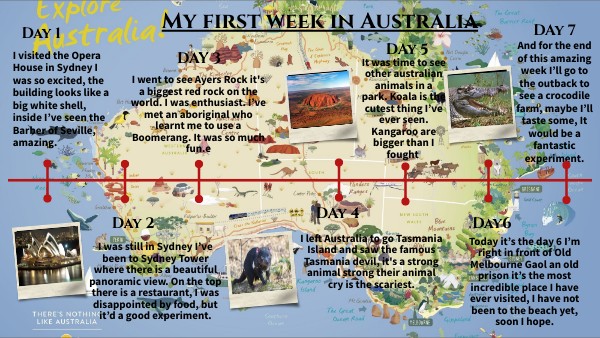 I went to see Ayers Rock it's a biggest red rock on the world. I was enthusiast. I’ve met an aboriginal who learnt me to use a Boomerang. It was so much fun.e