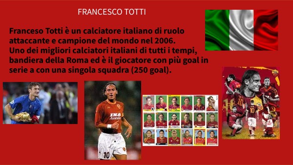 Franceso Totti è un calciatore italiano di ruolo attaccante e campione del mondo nel 2006.Uno dei migliori calciatori italiani di tutti i tempi, bandiera della Roma ed è il giocatore con più goal in serie a con una singola squadra (250 goal).