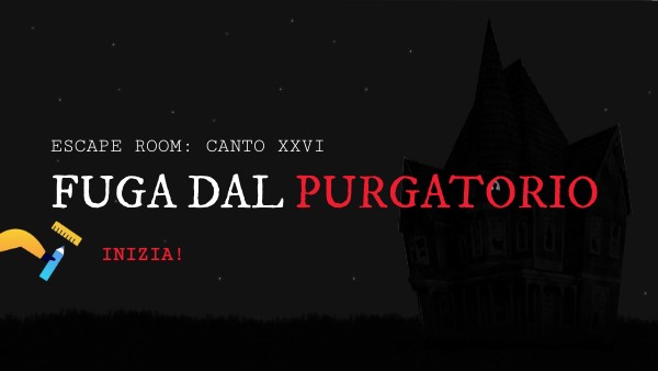 Siamo nella settima e ultima cornice del monte del Purgatorio. Dante è quasi alla fine del suo percorso, ma spetta a voi aiutarlo a uscire da qui per arrivare al Paradiso Terrestre! Nota bene: - per riuscirci avrete 60 minuti di tempo. - proseguendo, troverete vari elementi ed enigmi: la maggior parte può essere risolta nell'ordine che preferite; - i codici da inserire sono sempre senza maiuscole e senza spazi, prestate attenzione a tutto; - siate onesti, non proseguite pur non avendo risolto gli enigmi. Buona fuga e...che vinca il migliore