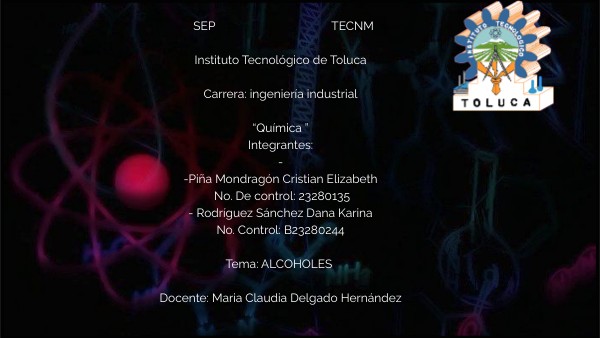 SEP TECNMInstituto Tecnológico de TolucaCarrera: ingeniería industrial“Química ”Integrantes:- -Piña Mondragón Cristian Elizabeth No. De control: 23280135- Rodríguez Sánchez Dana KarinaNo. Control: B23280244 Tema: ALCOHOLES Docente: Maria Claudia Delgado Hernández