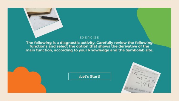 The following is a diagnostic activity. Carefully review the following functions and select the option that shows the derivative of the main function, according to your knowledge and the Symbolab site.