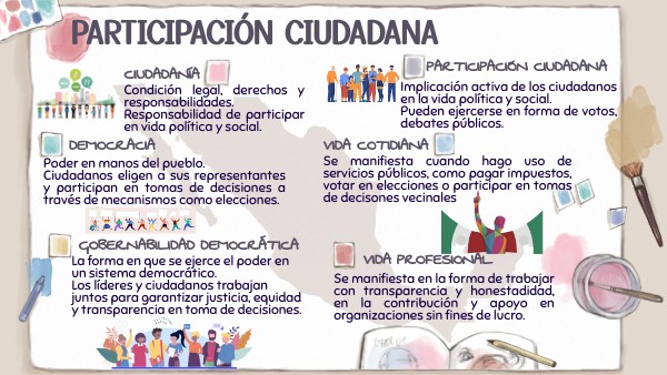 Implicación activa de los ciudadanos en la vida política y social.Pueden ejercerse en forma de votos, debates públicos.