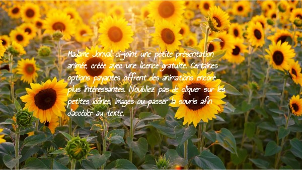 Madame Jonval, ci-joint une petite présentation animée, créée avec une licence gratuite. Certaines options payantes offrent des animations encore plus intéressantes. N'oubliez pas de cliquer sur les petites icônes, images ou passer la souris afin d'accéder au texte.