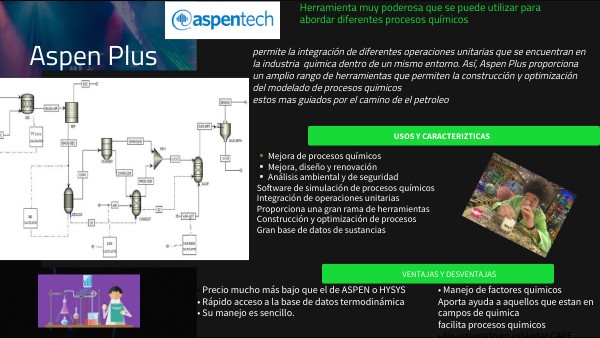▪ Mejora de procesos químicos ▪ Mejora, diseño y renovación ▪ Análisis ambiental y de seguridadSoftware de simulación de procesos químicos Integración de operaciones unitarias Proporciona una gran rama de herramientas Construcción y optimización de procesos Gran base de datos de sustancias