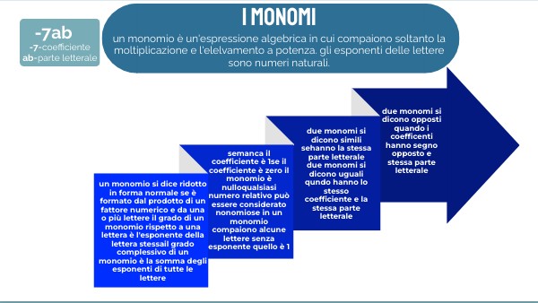 un monomio è un'espressione algebrica in cui compaiono soltanto la moltiplicazione e l'elelvamento a potenza. gli esponenti delle lettere sono numeri naturali.