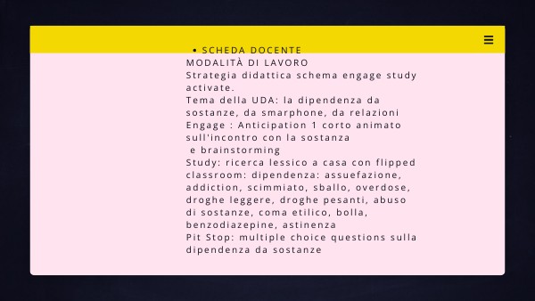 MODALITÀ DI LAVORO Strategia didattica schema engage study activate. Tema della UDA: la dipendenza da sostanze, da smarphone, da relazioni Engage : Anticipation 1 corto animato sull'incontro con la sostanza e brainstorming Study: ricerca lessico a casa con flipped classroom: dipendenza: assuefazione, addiction, scimmiato, sballo, overdose, droghe leggere, droghe pesanti, abuso di sostanze, coma etilico, bolla, benzodiazepine, astinenza Pit Stop: multiple choice questions sulla dipendenza da sostanzeschedA DOCENTE