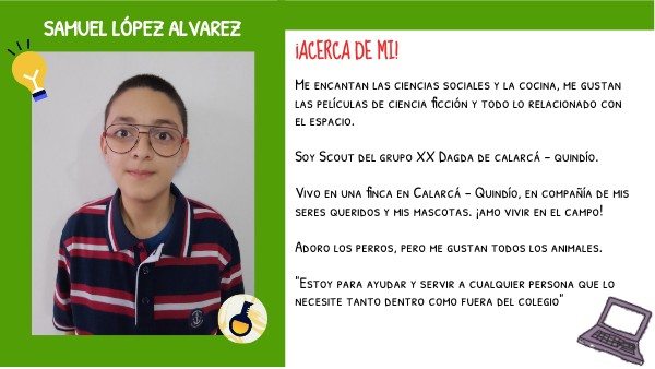 Me encantan las ciencias sociales y la cocina, me gustan las películas de ciencia ficción y todo lo relacionado con el espacio. Soy Scout del grupo XX Dagda de calarcá - quindío. Vivo en una finca en Calarcá - Quindío, en compañía de mis seres queridos y mis mascotas. ¡amo vivir en el campo! Adoro los perros, pero me gustan todos los animales. "Estoy para ayudar y servir a cualquier persona que lo necesite tanto dentro como fuera del colegio"