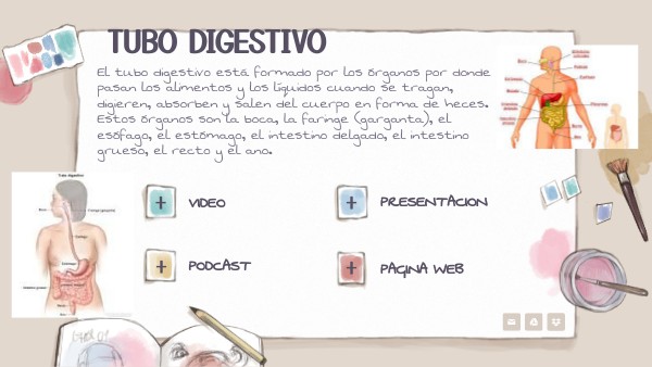 El tubo digestivo está formado por los órganos por donde pasan los alimentos y los líquidos cuando se tragan, digieren, absorben y salen del cuerpo en forma de heces. Estos órganos son la boca, la faringe (garganta), el esófago, el estómago, el intestino delgado, el intestino grueso, el recto y el ano.
