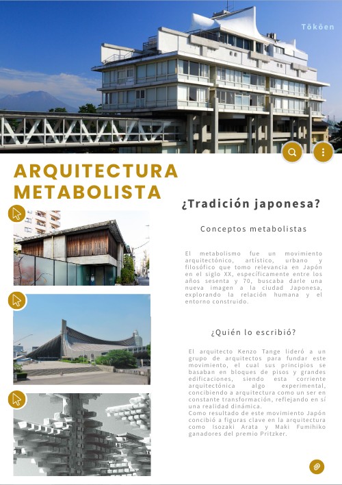 El metabolismo fue un movimiento arquitectónico, artístico, urbano y filosófico que tomo relevancia en Japón en el siglo XX, específicamente entre los años sesenta y 70, buscaba darle una nueva imagen a la ciudad Japonesa, explorando la relación humana y el entorno construido.