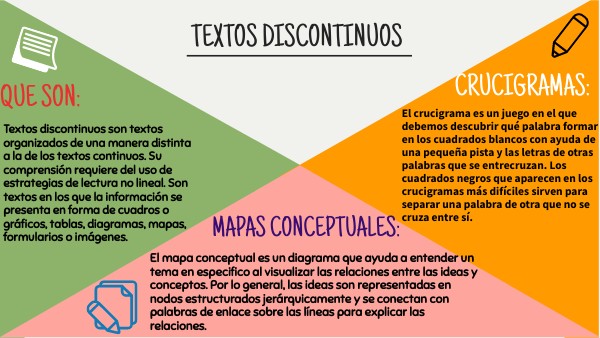 Textos discontinuos son textos organizados de una manera distinta a la de los textos continuos. Su comprensión requiere del uso de estrategias de lectura no lineal. Son textos en los que la información se presenta en forma de cuadros o gráficos, tablas, diagramas, mapas, formularios o imágenes.