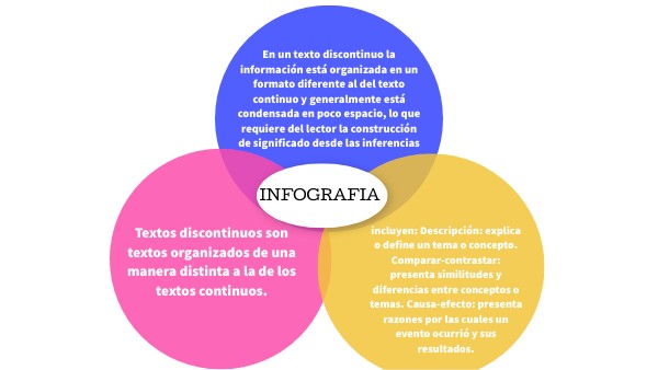 En un texto discontinuo la información está organizada en un formato diferente al del texto continuo y generalmente está condensada en poco espacio, lo que requiere del lector la construcción de significado desde las inferencias