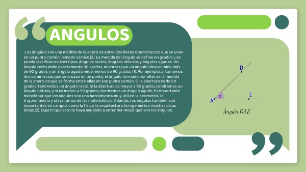 Los ángulos son una medida de la abertura entre dos líneas o semirrectas que se unen en un punto común llamado vértice [2]. La medida del ángulo se define en grados y se puede clasificar en tres tipos: ángulos rectos, ángulos obtusos y ángulos agudos. Un ángulo recto mide exactamente 90 grados, mientras que un ángulo obtuso mide más de 90 grados y un ángulo agudo mide menos de 90 grados [1]. Por ejemplo, si tomamos dos semirrectas que se cruzan en un punto, el ángulo formado por ellas es la medida de la abertura que se forma entre ellas en ese punto común. Si la abertura es de 90 grados, tendremos un ángulo recto. Si la abertura es mayor a 90 grados, tendremos un ángulo obtuso, y si es menor a 90 grados, tendremos un ángulo agudo. Es importante mencionar que los ángulos son una herramienta muy útil en la geometría, la trigonometría y otras ramas de las matemáticas. Además, los ángulos también son importantes en campos como la física, la arquitectura, la ingeniería y muchas otras áreas [2]. Espero que esto te haya ayudado a entender mejor qué son los ángulos.
