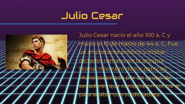 Julio Cesar nacio el año 100 a. C y murio el 15 de marzo de 44 a. C. Fue un importante politico y militar dictador romano en la antigua Roma, miembro de los patricios. Murio asesinado por un grupo de senadores que conspiraron contra el para acabar con su dictadura.