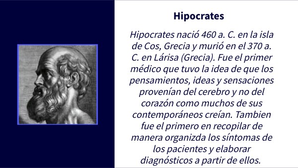 Hipocrates nació 460 a. C. en la isla de Cos, Grecia y murió en el 370 a. C. en Lárisa (Grecia). Fue el primer médico que tuvo la idea de que los pensamientos, ideas y sensaciones provenían del cerebro y no del corazón como muchos de sus contemporáneos creían. Tambien fue el primero en recopilar de manera organizda los síntomas de los pacientes y elaborar diagnósticos a partir de ellos.