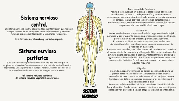 Enfermedad de Parkinson Afecta a las neuronas en el área del cerebro que controla el movimiento muscular. La degeneración y muerte de estas neuronas provoca una disminución de los niveles de dopamina en el cerebro, lo que provoca los síntomas característicos Movimiento lento, temblores en reposo de las manos, los brazos, las piernas y la cara, o dificultad para tragar Alzheimer Una forma de demencia que resulta de la degeneración del tejido nervioso y generalmente ocurre en personas mayores de 65 años, pero también puede afectar a personas más jóvenes. Existen varias hipótesis sobre su causa, entre ellas una disminución de los neurotransmisores o una acumulación de proteínas en el cerebro. En sus etapas iniciales, afecta las partes del cerebro que controlan el pensamiento, la memoria y el lenguaje. Más tarde, se desarrolla dificultad para hablar, leer o escribir. Posteriormente, ansiedad y agresividad o deambulación. Por último, los pacientes necesitan una atención holística. Es la forma más común de demencia en adultos mayores. Migraña Dolor de cabeza muy intenso de origen desconocido, aunque parece estar relacionado con la dilatación de las arterias craneales. Ocurre tres veces más a menudo en mujeres que en hombres. Los dolores de cabeza pueden variar en intensidad y duración de horas a días. Aumento de la intensidad del dolor de cabeza. Sensibilidad a la luz y al sonido. Puede causar náuseas, vómitos y mareos. Algunas personas ven destellos o líneas irregulares antes de entenderlo.