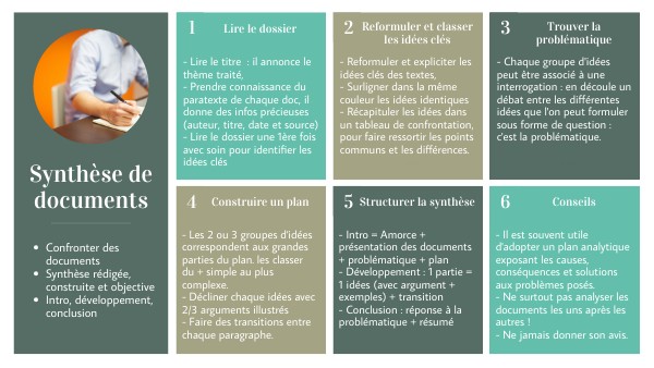- Il est souvent utile d'adopter un plan analytique exposant les causes, conséquences et solutions aux problèmes posés. - Ne surtout pas analyser les documents les uns après les autres ! - Ne jamais donner son avis.
