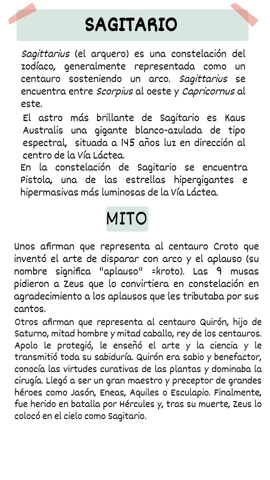 Sagittarius (el arquero) es una constelación del zodíaco, generalmente representada como un centauro sosteniendo un arco. Sagittarius se encuentra entre Scorpius al oeste y Capricornus al este.