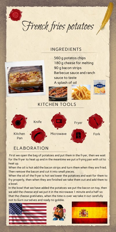 First we open the bag of potatoes and put them in the fryer, then we wait for the fryer to heat up and in the meantime we put a frying pan with oil to heat up. When the oil is hot add the bacon strips and turn them when they are fried. Then remove the bacon and cut it into small pieces. When the oil of the fryer is hot we lower the potatoes and wait for them to fry properly, then when they are finished we take them out and add them to a bowl. In the bowl that we have added the potatoes we put the bacon on top, then we add the cheese and we put it in the microwave 1 minute and a half so that the cheese gratinates, when the time is over we take it out carefully not to burn ourselves and ready to gobble.