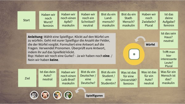 Anleitung: Wählt eine Spielfigur. Klickt auf den Würfel um zu würfeln. Geht mit eurer Spielfigur die Anzahl der Felder, die der Würfel vorgibt. Formuliert eine Antwort auf die Fragen. Verwendet Pronomen. Überprüft eure Antwort, indem ihr auf das Spielfeld klickt. Bsp: Haben wir noch eine Gurke? - Ja wir haben noch eine. / Nein wir haben keine.