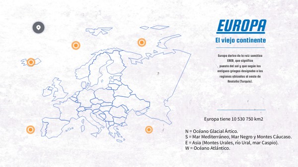 N = Océano Glacial Ártico. S = Mar Mediterráneo, Mar Negro y Montes Cáucaso. E = Asia (Montes Urales, río Ural, mar Caspio). W = Océano Atlántico.