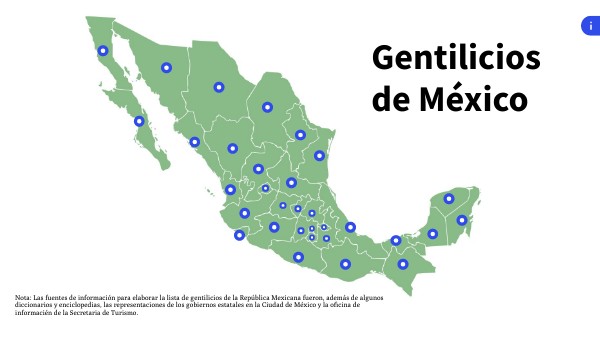 Nota: Las fuentes de información para elaborar la lista de gentilicios de la República Mexicana fueron, además de algunos diccionarios y enciclopedias, las representaciones de los gobiernos estatales en la Ciudad de México y la oficina de informacién de la Secretaria de Turismo.