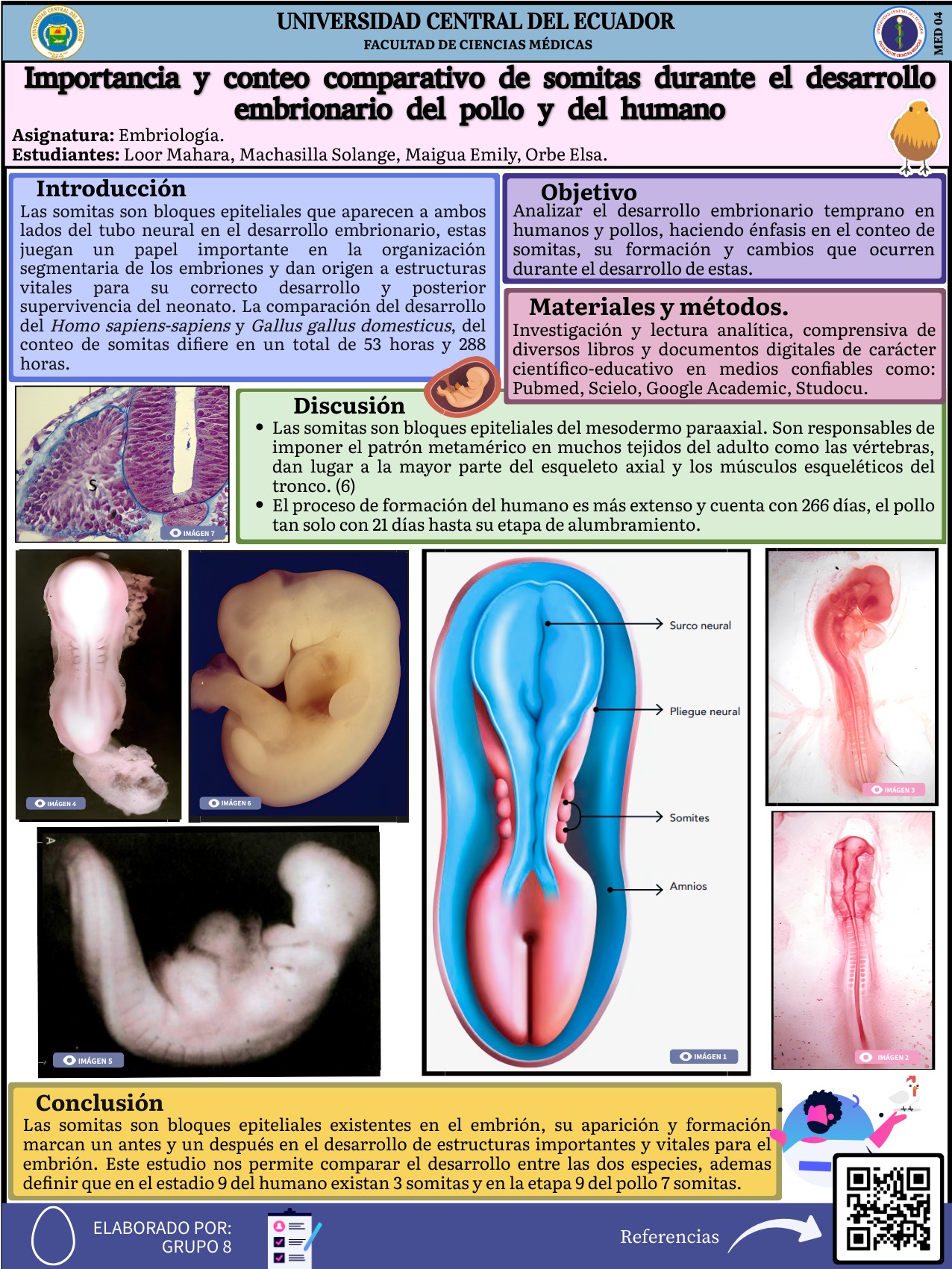 Las somitas son bloques epiteliales existentes en el embrión, su aparición y formación marcan un antes y un después en el desarrollo de estructuras importantes y vitales para el embrión. Este estudio nos permite comparar el desarrollo entre las dos especies, ademas definir que en el estadio 9 del humano existan 3 somitas y en la etapa 9 del pollo 7 somitas.