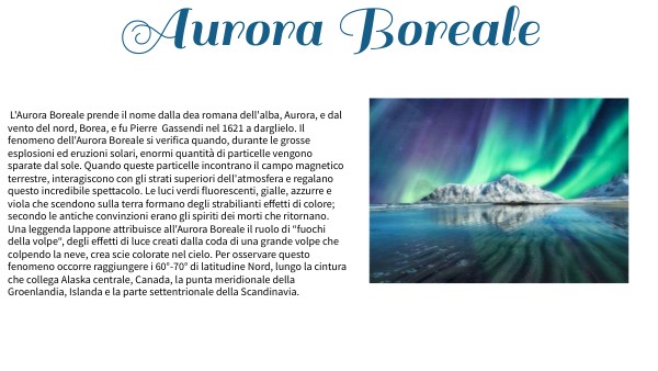 L'Aurora Boreale prende il nome dalla dea romana dell'alba, Aurora, e dal vento del nord, Borea, e fu Pierre Gassendi nel 1621 a darglielo. Il fenomeno dell'Aurora Boreale si verifica quando, durante le grosse esplosioni ed eruzioni solari, enormi quantità di particelle vengono sparate dal sole. Quando queste particelle incontrano il campo magnetico terrestre, interagiscono con gli strati superiori dell'atmosfera e regalano questo incredibile spettacolo. Le luci verdi fluorescenti, gialle, azzurre e viola che scendono sulla terra formano degli strabilianti effetti di colore; secondo le antiche convinzioni erano gli spiriti dei morti che ritornano. Una leggenda lappone attribuisce all'Aurora Boreale il ruolo di “fuochi della volpe“, degli effetti di luce creati dalla coda di una grande volpe che colpendo la neve, crea scie colorate nel cielo. Per osservare questo fenomeno occorre raggiungere i 60°-70° di latitudine Nord, lungo la cintura che collega Alaska centrale, Canada, la punta meridionale della Groenlandia, Islanda e la parte settentrionale della Scandinavia.