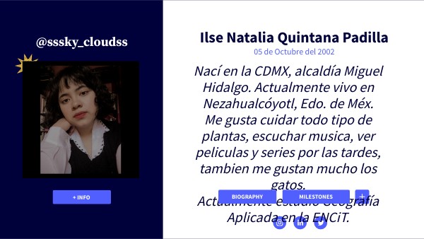 Nací en la CDMX, alcaldía Miguel Hidalgo. Actualmente vivo en Nezahualcóyotl, Edo. de Méx. Me gusta cuidar todo tipo de plantas, escuchar musica, ver peliculas y series por las tardes, tambien me gustan mucho los gatos. Actualmente estudio Geografía Aplicada en la ENCiT.