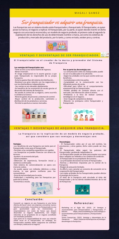 Marketing en el Siglo XXI. (2023). 24. Ventajas e inconvenientes para franquiciadores y franquiciados. 5ª Edición. https://www.marketing-xxi.com/ventajas-e-inconvenientes-para-franquiciadores-y-franquiciados-75.htmTormo franquicias. (2022). Ventajas y desventajas de la franquicia. https://www.tormofranquicias.es/ventajas-desventajas-la-franquicia/