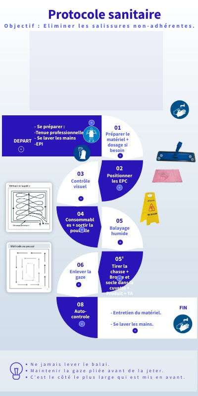 - Identifier le type de sol et de salissures (degré), la taille de la surface et la demande.